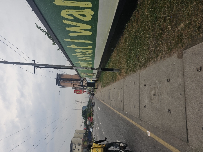 The image captures an urban street scene in Animshaun, Nigeria, under an overcast sky. In the foreground, a concrete sidewalk composed of rectangular slabs runs parallel to an asphalt road. Embedded metal U-shaped hooks are visible on several sidewalk slabs. To the right of the sidewalk, a strip of sparse, dry grass separates it from a long, green wall with a white base. Large yellow lettering, partially legible as "want what I wa," is painted on this green wall, which is topped with barbed wire. A dark utility pole, supporting multiple overhead electrical wires, stands between the sidewalk and the wall. To the left of the sidewalk, an asphalt road features a solid yellow line along its edge. A person on a bicycle, wearing a yellow delivery backpack, is visible in the lower-left corner, cycling away from the viewer along the road. In the midground, several vehicles, including cars and a white van, are visible on the road, traveling in both directions. Further down the street, various urban structures, including multi-story buildings and what appears to be a commercial building with a brown facade, are present. Streetlights, traffic signals, and additional utility poles line the distant road.
