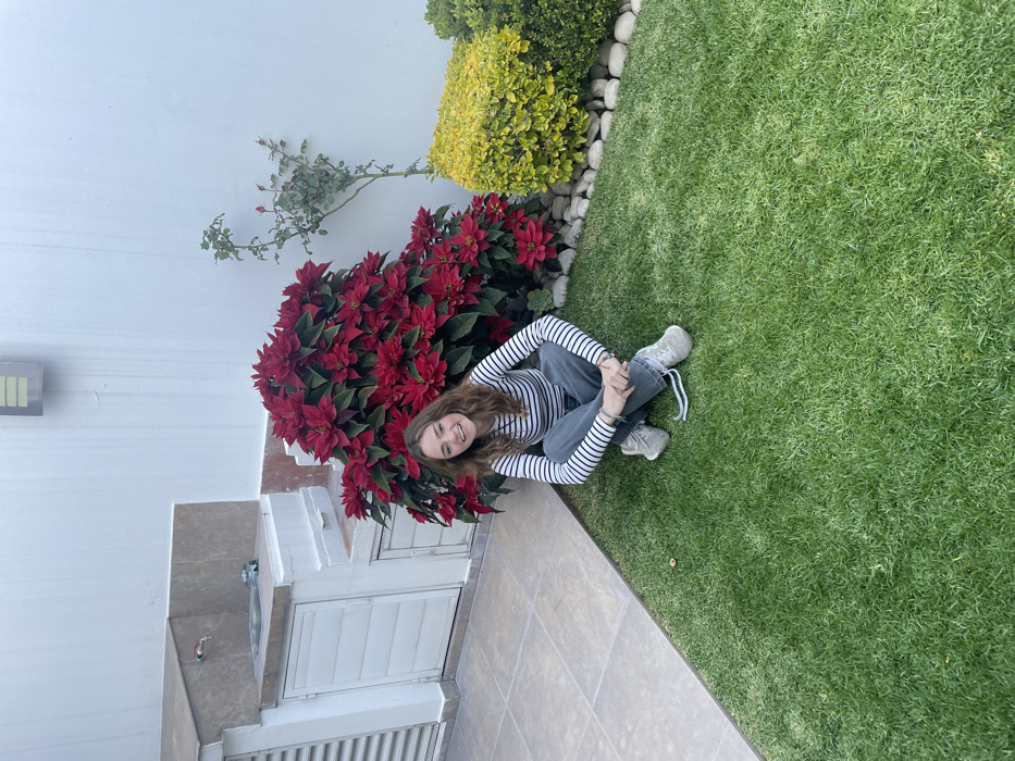A young woman sits cross-legged on green grass near red poinsettia plants and a white wall. She wears a striped shirt, jeans, and gray sneakers, and has brown hair and a smile. Behind her are plants of red and yellow. To the left is a light-colored tile patio with a white structure with a sink.