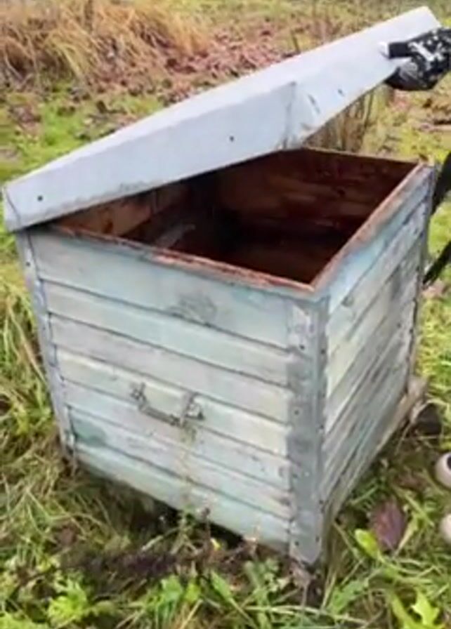 person opening the lid of a square, wooden hive-like structure that is outdoors on a grassy surface. The structure is painted light blue, and the lid is silver. Upon opening the lid, the interior of the structure is revealed, and a light-colored, honeycomb-like nest is visible attached to the side wall near the top. The wooden interior is stained with what appears to be a dark brown or reddish substance. The ground surrounding the hive is covered in grass and leaves, suggesting an outdoor setting. A person's lower legs and shoes can be seen near the base of the hive.