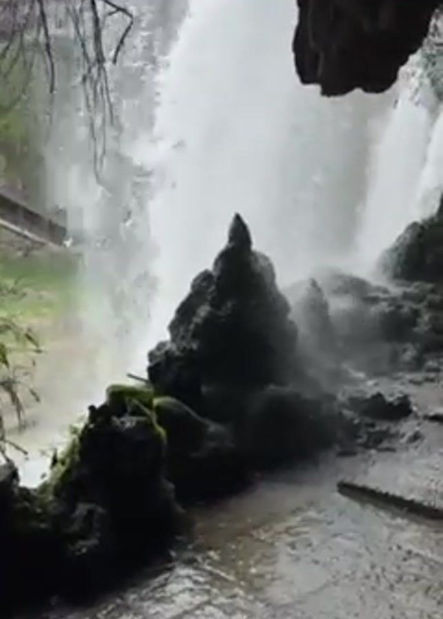 view from behind a waterfall, looking out through the falling water. In the foreground are dark, wet rocks covered with moss. The waterfall fills most of the frame, with a bright white cascade of water. The sound of rushing water is prominent. Above and slightly behind the rocks, the waterfall splits into multiple streams. The background shows some greenery and part of a building structure. The lighting is overcast and diffused, adding to the misty atmosphere.