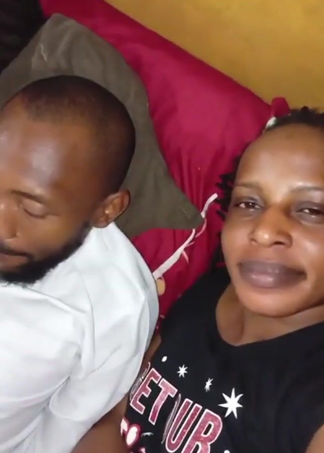 A medium shot shows two adults relaxing, possibly on a bed. The wall behind them is yellowish, and a red pillow is visible. The woman is holding a smartphone and taking a selfie. She is wearing a black t-shirt with white stars and "ETUR" printed on it. She has a light complexion and her hair is pulled back. The man has a shaved head and a neatly trimmed beard. He is wearing a white shirt. He appears to be resting or sleeping. The audio features some kind of music.