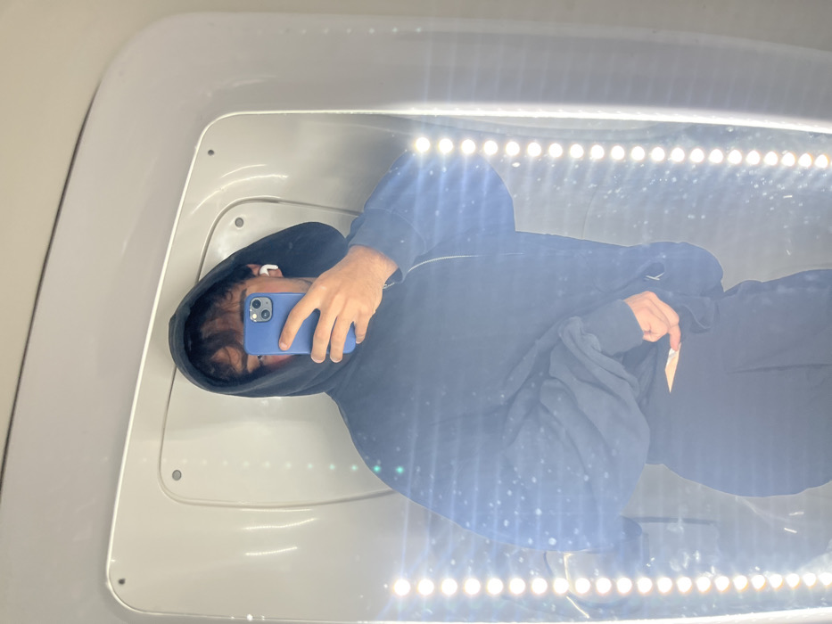 - "A person wearing a black hoodie and an AirPod lies inside a white, capsule-like structure with a row of bright lights along the side" by FM-vIRwr1, licensed under CC BY 4.0