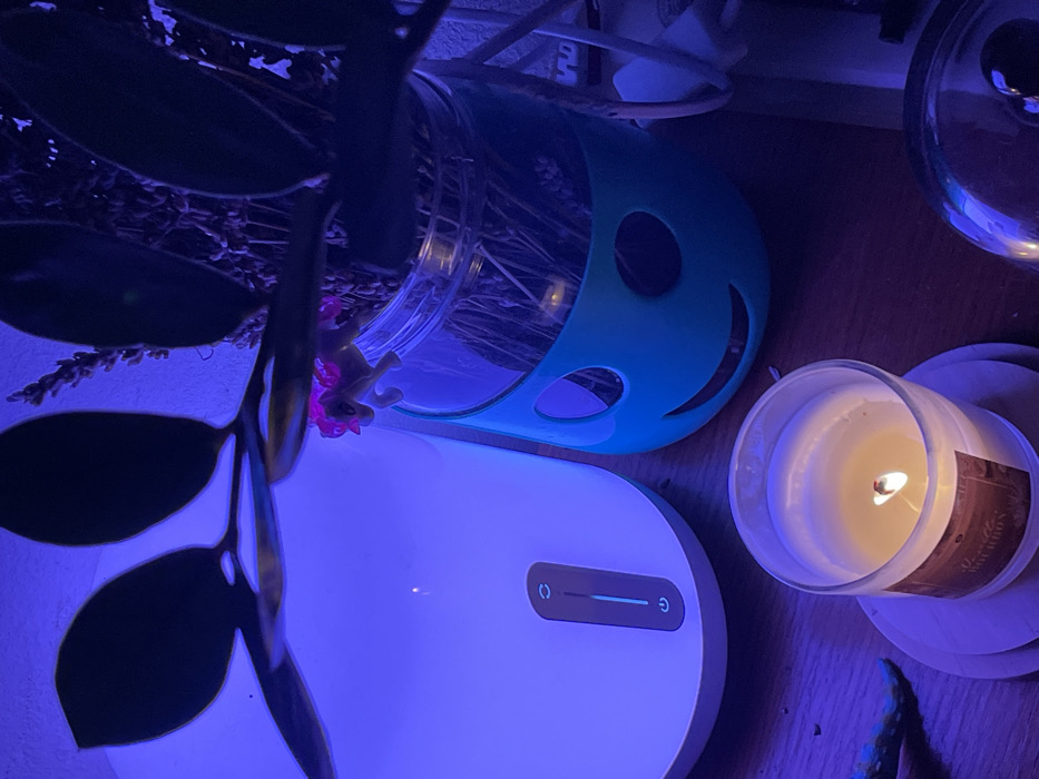 The image displays a scene with blue lighting, featuring a lit candle in a glass container next to a white electronic device with power buttons. A clear glass jar with dried lavender and a teal smiling face surround is nearby. A ZZ plant with dark leaves is to the left, and a small toy pony sits on the jar. A wooden surface is visible in the background.