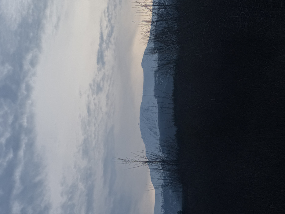 The scene depicts a panoramic landscape captured during twilight hours, likely at dusk or dawn, from the vicinity of Bistritsa, Bulgaria, facing a distant, snow-covered mountain range. The upper third of the image shows a cloudy sky, transitioning from pale grey and hints of soft orange/pink near the horizon to darker grey patches overhead. The mid-ground is dominated by a prominent mountain range, likely Vitosha, with its upper slopes and peaks extensively covered in white snow. A small, dark, man-made structure, consistent with a building or tower, is visible on the highest snow-covered peak towards the left-center of the frame, possibly the Cherni Vrah meteorological station. The lower half of the image is composed of a dark, silhouetted foreground of dense, leafless deciduous trees and shrubs, with individual bare branches of taller trees discernible against the lighter mountain and sky. No people, specific actions, or interactions are present. The overall lighting is low, creating a stark contrast between the bright, snow-covered mountains and the dark foreground vegetation.