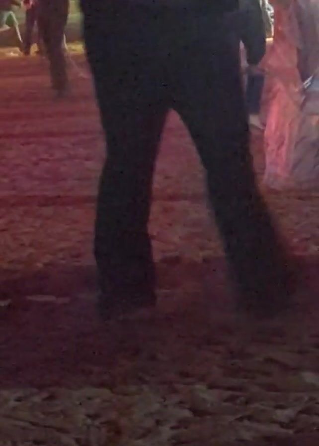 People are walking around a dirt area. The lighting is dim, and there's red and blue light present. Some people are standing still in the background. One person is running in the foreground.