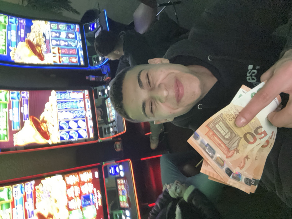 An interior image depicts a gaming establishment in Oryahovo, Bulgaria. The primary subject is a young male, possibly in his late teens or early twenties, with short dark hair and a light complexion, wearing a dark hoodie. He is positioned in the foreground, facing the camera with a wide, smiling expression, eyes squinted. He holds a fan of several 50 Euro banknotes in his left hand, angled towards the camera. His right index finger points directly at the currency. In the mid-ground, to the immediate left of the main subject, another individual is partially visible, seated, wearing a dark jacket with light-colored trim and blue trousers. To the right, further into the background, a third male individual with dark hair is seated facing away from the camera, engaged with a slot machine. Three brightly lit slot machines dominate the background. The two central machines display typical game graphics, including symbols like bells and coins. The machine on the far right shows "2100 EUR" at the top and "2100.00" in the play area, indicative of current credits or a winning sum. A plastic water bottle rests on a surface beside this machine. The environment is dimly lit, with the slot machine screens providing the main illumination. A dark, possibly artificial, plant is visible in the upper right background.