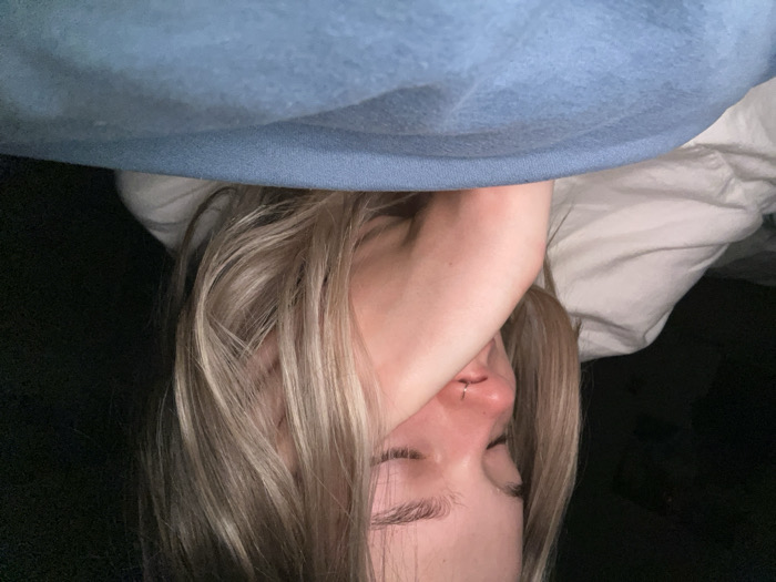 A person lies under a blue fabric, possibly a blanket. Their face, including a nose piercing, is partially obscured by their arm. The person's eyes are closed. Light blonde hair falls across their face. The background includes a white sheet and a dark, indistinct area. The photo's composition is upside down.