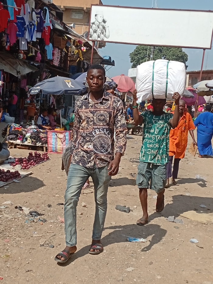 A busy outdoor market scene features a man in a patterned Versace shirt and jeans standing in the foreground. Behind him, another man carries a large white sack on his head. Other people stroll by, and market stalls filled with goods such as clothing, onions, and umbrellas are visible. Trash litters the ground. A sign above displays an image of a man on a phone.