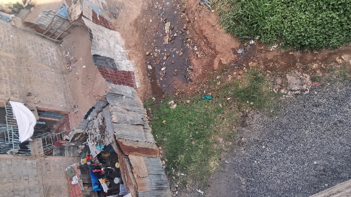The image depicts an aerial view of a densely populated, low-income residential area consistent with an informal settlement in Nairobi, Kenya. **Environment:** The scene is characterized by unpaved, uneven ground consisting of reddish-brown soil, dark gravel, and muddy patches. Several areas show standing water mixed with debris, suggesting poor drainage. Scattered patches of green grass and denser green foliage are visible. Significant amounts of domestic litter, including plastic bags, discarded containers, and miscellaneous refuse, are present across the ground. **Structures:** In the upper portion of the frame, a multi-story building constructed from unplastered concrete blocks is visible. A metal staircase, painted light blue, descends from an upper floor. A white fabric is draped over the railing of this staircase. To the left of this main building, several smaller, makeshift structures are present. These consist primarily of corrugated iron sheets, some rusted, forming walls and roofs. One structure features a reddish-brown tarpaulin or similar material as a roof. **Objects and Activities:** * Within the compound of the makeshift structures, a clothesline is visible with various garments hanging to dry, including blue, yellow, white, and red items. * Numerous domestic items such as plastic buckets, basins, and other containers are scattered around the clothesline area, suggesting laundry activity. * The corrugated iron sheets are also used to construct fences and partitions, some showing signs of weathering and rust, dividing the different living spaces. * No individuals are visible in the captured frame. The overall impression is one of a challenging living environment with limited infrastructure, common in informal settlements.