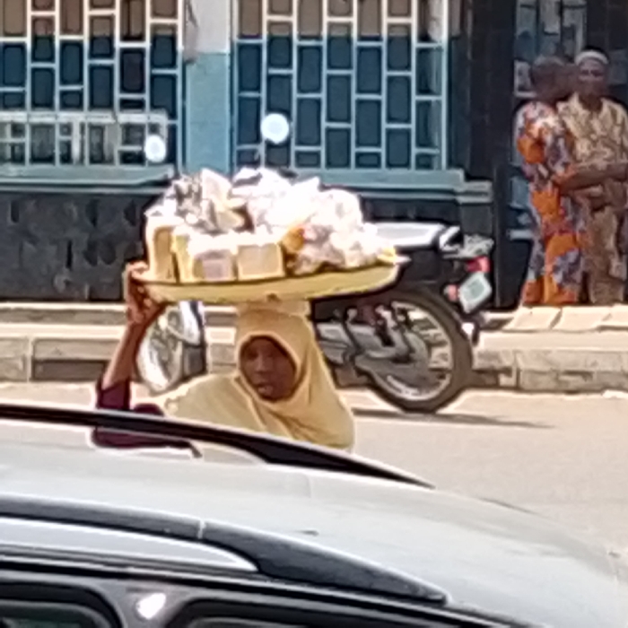 A woman in a hijab carries a tray of food on her head, possibly bread or pastries