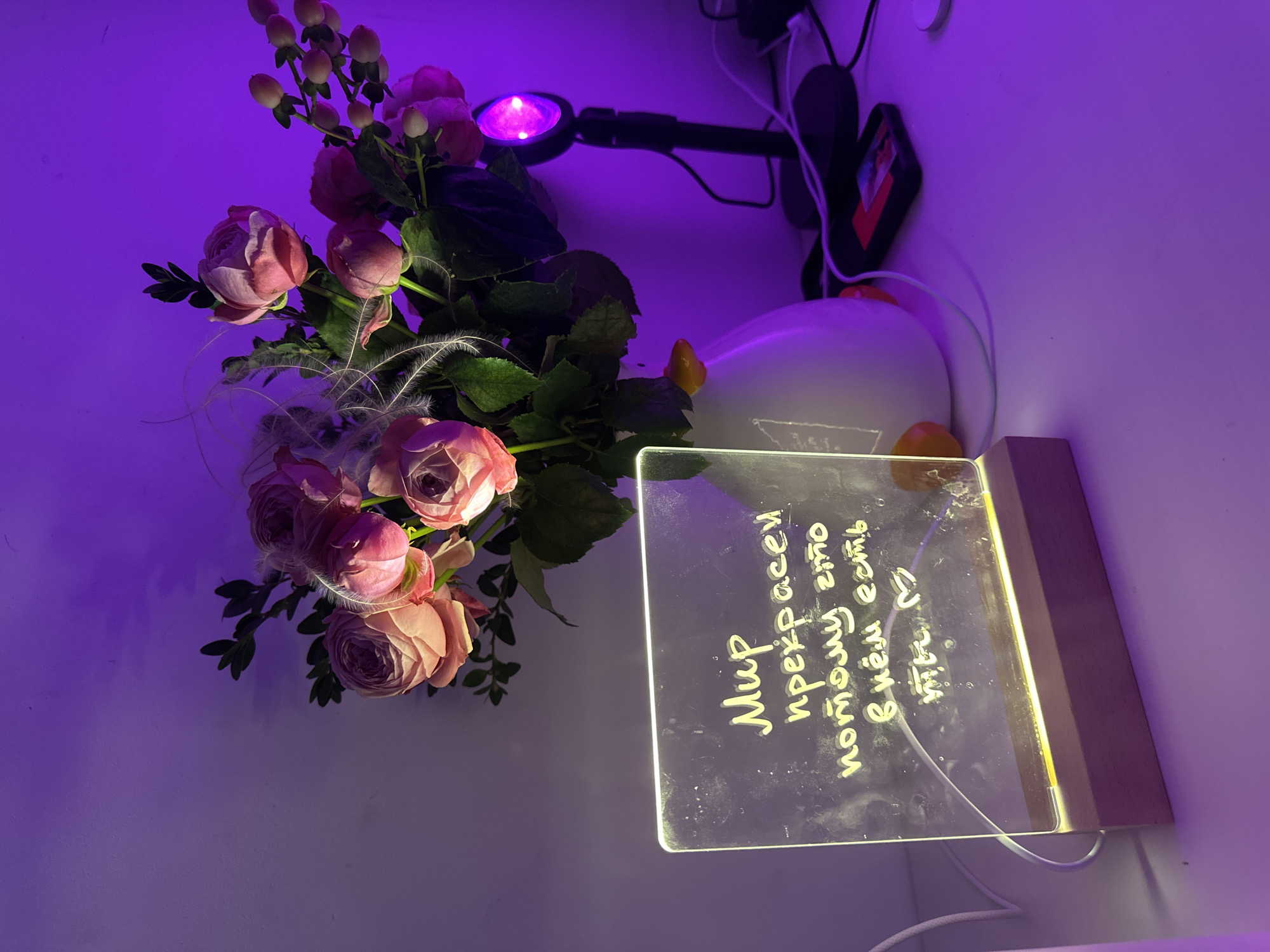 A bouquet of pink roses is situated next to a lighted acrylic board with Cyrillic writing in a room with violet lighting. The acrylic board has a wooden base and sits at a slight angle. Behind the flowers, there's a black desk lamp with a purple light, as well as a black object with white cables attached. An off-white spherical object with an orange object next to it sits between the flowers and the lamp. Location: Likely a room with a studio light, and no indication Moscow, Russia is present.