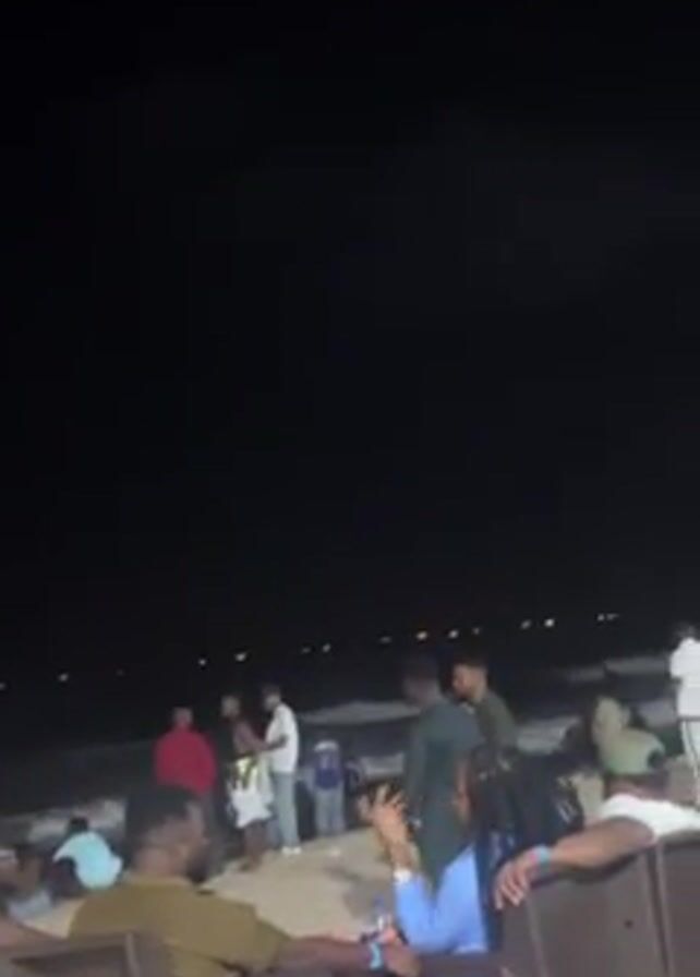 beach at night. Several people are standing and walking near the shoreline. Some are gathered in small groups. Chairs are situated on the sand in the foreground. Waves are visible, and some lights appear on the horizon in the distance. It's dark, and the beach seems relatively busy.