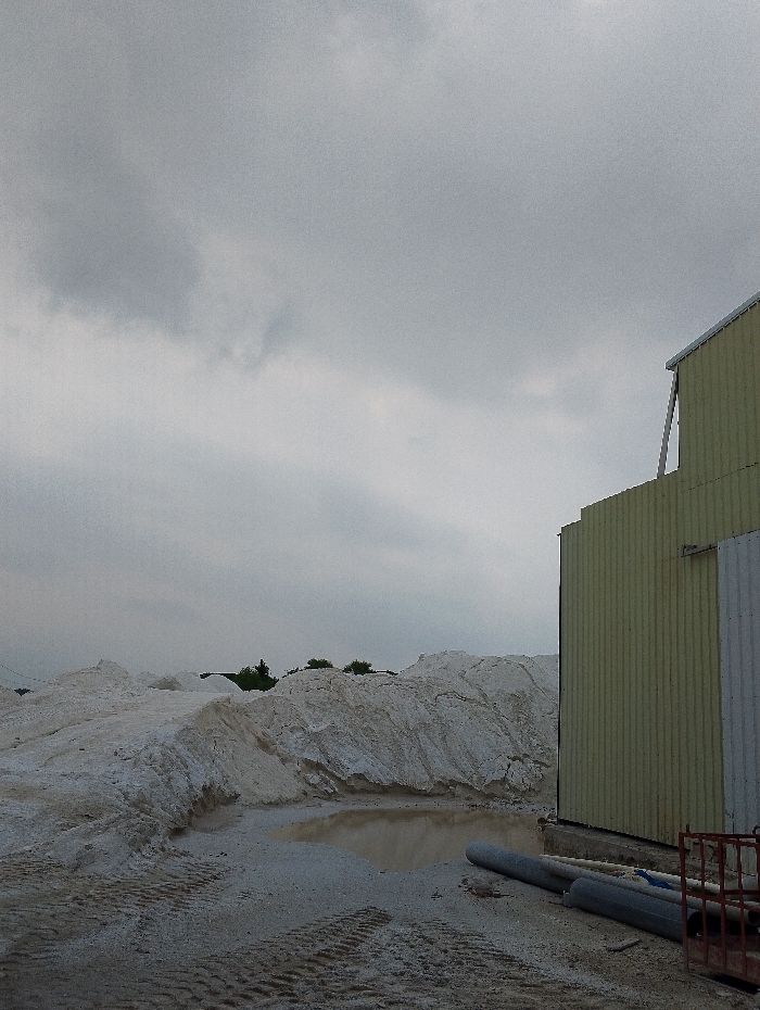 large pile of white sand in the foreground. The sand is piled high, creating a large, rounded mound. There is a small puddle of water in the middle of the sand. On the right side of the image, a large yellow metal building stands partially visible. The building has a corrugated metal wall and a white roof. The sky is overcast with grey clouds. The image was taken in a remote area on the outskirts of Pangasia, Bangladesh (latitude: 22.693, longitude: 90.601). There are no people in the image. There are two large grey pipes lying in the foreground near the building, and other assorted metal debris in the foreground.