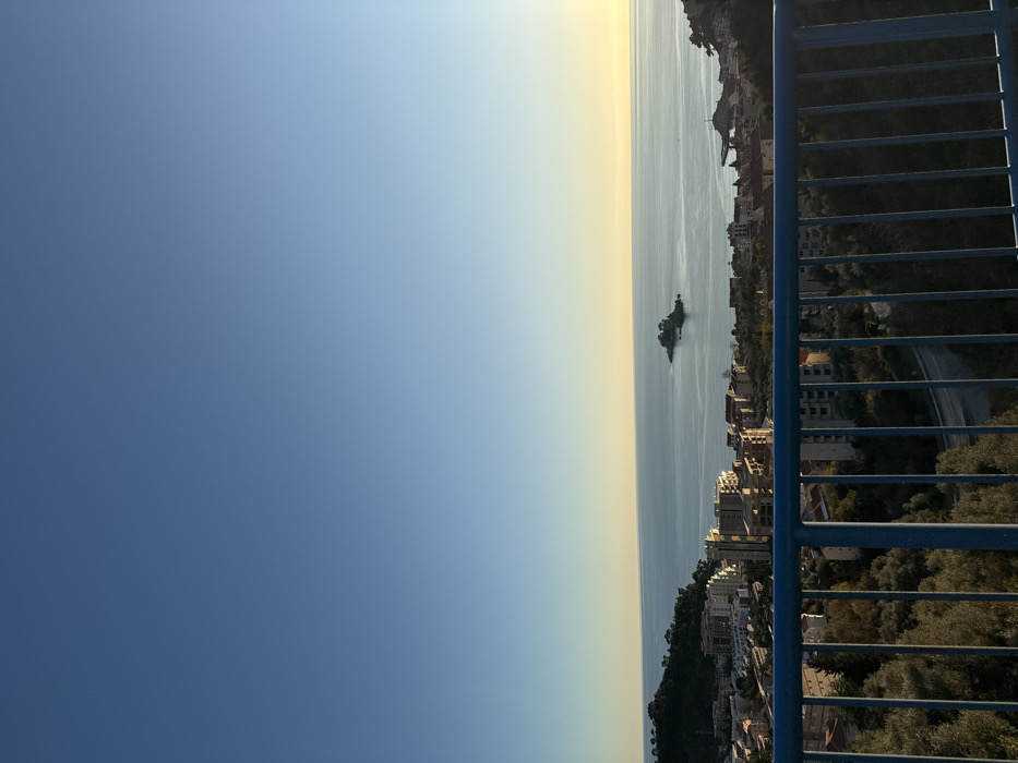 The image displays an elevated, panoramic view of Petrovac na Moru, Montenegro. In the foreground, a prominent blue metal railing with vertical bars runs horizontally across the bottom section, indicating a viewing platform or bridge. Below the railing, dense green vegetation, primarily olive trees, covers the immediate hillside. The midground features the coastal town of Petrovac na Moru, characterized by numerous multi-story buildings with various architectural styles, extending along the shoreline of a bay. A verdant, tree-covered hillside slopes down to the town on the left. The Adriatic Sea occupies the central and right midground, appearing calm and reflecting the clear sky. Within the bay, a small, rocky island, consistent with Katic or Sveta Nedjelja Island, is visible with sparse vegetation and a small structure on its surface. The background consists of a clear, expansive sky, transitioning from a deeper blue at the top to a lighter, warm yellowish-blue hue near the horizon line, indicative of early morning or late afternoon sunlight. The sun itself is not visible in the frame but casts a warm glow from the right. No individuals, specific actions, or interactions are discernible within the scene.