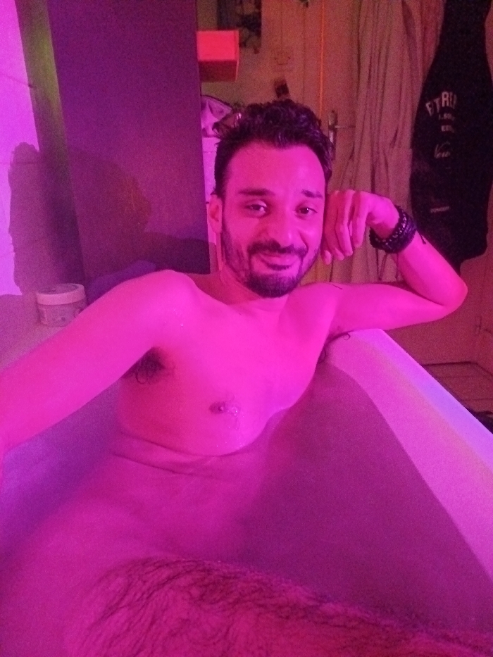 A man is in a bathtub filled with water. He is shirtless and has dark hair and a beard. He rests his head on his right hand, which is adorned with dark bracelets. The lighting is predominantly pink, casting an unusual hue over the scene. In the background, a black garment hangs, partially obscured. A jar-like container is situated beside him. The ambiance is intimate and relaxed.