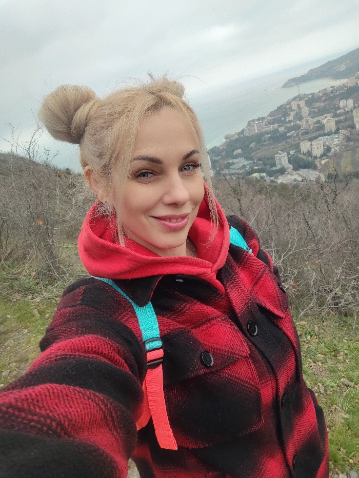 A female subject is depicted in a selfie, positioned outdoors at an elevated viewpoint. She possesses blonde hair styled into two top knots and blue eyes, with a small stud visible on her left nostril. She is smiling towards the camera. Her attire consists of a red hooded sweatshirt layered under a red and black plaid button-up jacket. A backpack with bright orange and turquoise straps is worn over the jacket. The background features a sloping landscape with sparse, dormant vegetation. Further in the distance, a coastal urban area with multiple multi-story buildings is visible along a curving shoreline adjacent to a body of water. The sky above is overcast. This location is identified as Partenit, Ukraine.