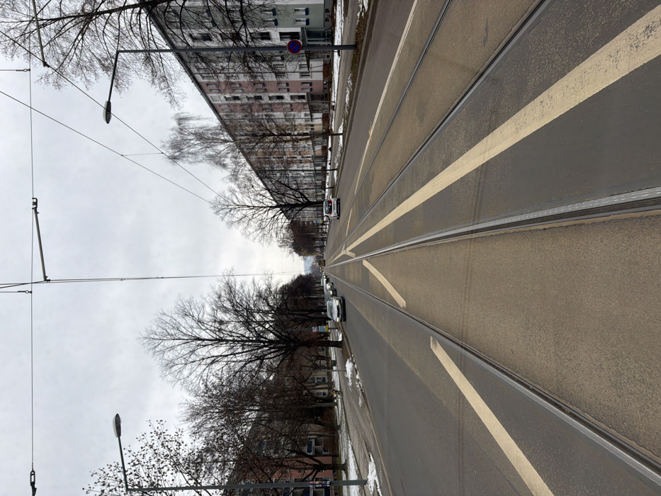 This image presents a wide, multi-lane street in Dresden, Germany, under an overcast sky. The perspective is centered on a set of tram tracks running down the middle of the road, featuring light-colored arrow markings painted on the asphalt, indicating a split in the tracks. To the left of the tram tracks is a roadway with several parked vehicles, including at least five silver or light-colored sedans. This roadway is bordered by a sidewalk and a line of bare deciduous trees. Behind these trees, residential buildings with multiple stories and various architectural details are visible. Patches of snow and bare ground are present along the sidewalk. To the right of the tram tracks, another roadway is visible with a single white sedan driving away from the viewer. This side is also lined with bare deciduous trees and a sidewalk containing patches of snow. A prominent, long multi-story residential building with light-colored facades, including sections of pink and white, dominates the right side of the image. A red and white circular "no stopping" traffic sign is affixed to a pole on the right sidewalk. Overhead, a complex network of black electrical wires for the tram system spans the width of the street. Modern streetlights with oval fixtures are present on poles along both sides of the thoroughfare. The bare trees and snow remnants indicate a winter or early spring season. No individuals are visible in the scene. The street extends into the distance, with the terrain appearing to rise slightly towards the horizon.