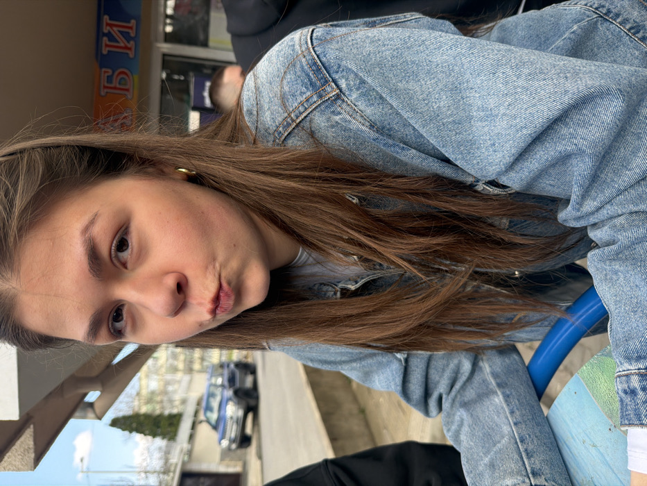 A young female subject is depicted in a medium shot, looking directly at the camera with her lips pursed. She has long brown hair and is wearing a light blue denim jacket over a white undershirt, with small gold hoop earrings visible. Her left forearm rests on a blue and light green surface in the immediate foreground. To her right, the top of another individual's head with short hair and part of a black garment are visible. A third person, denoted only by a black garment, is partially visible to the subject's left. The background reveals an outdoor urban environment in Stara Zagora, Bulgaria. A paved street is visible, with a blue SUV parked on the left. Further back, a tall evergreen tree and buildings with light-colored facades are present. To the right of the main subject, a commercial establishment features a sign with red and blue Cyrillic letters "АБИ". An overhead structure, possibly an awning or building overhang, is visible at the top of the frame. The sky is partially visible and blue.
