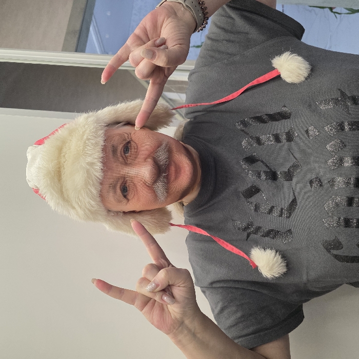 An individual is depicted indoors, viewed from the chest up, wearing a beige, fur-trimmed ushanka-style hat with pink ribbons terminating in white pom-poms