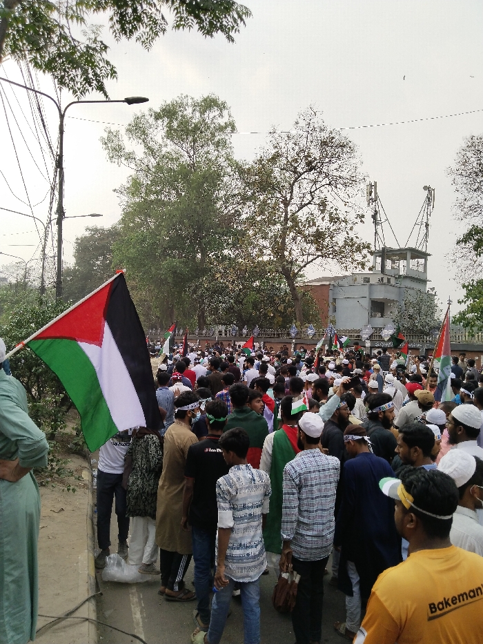The image captures a large crowd of people gathered on a street in Dhaka, Bangladesh, specifically at the coordinates 23.738 latitude and 90.399 longitude. The scene is likely a political rally or demonstration, as evidenced by the presence of a large Palestinian flag, other flags, and the crowd's density and visible enthusiasm. Many participants wear traditional white caps, suggesting a religious or cultural affiliation. The crowd is dense, with people packed together, some holding flags and banners, and others engaged in conversation. Behind the crowd, a grey building with a guard tower can be seen. The environment is characterized by a busy street with wires and poles overhead, lush greenery, and a clear sky with some clouds. The scene is filled with a sense of energy and anticipation.