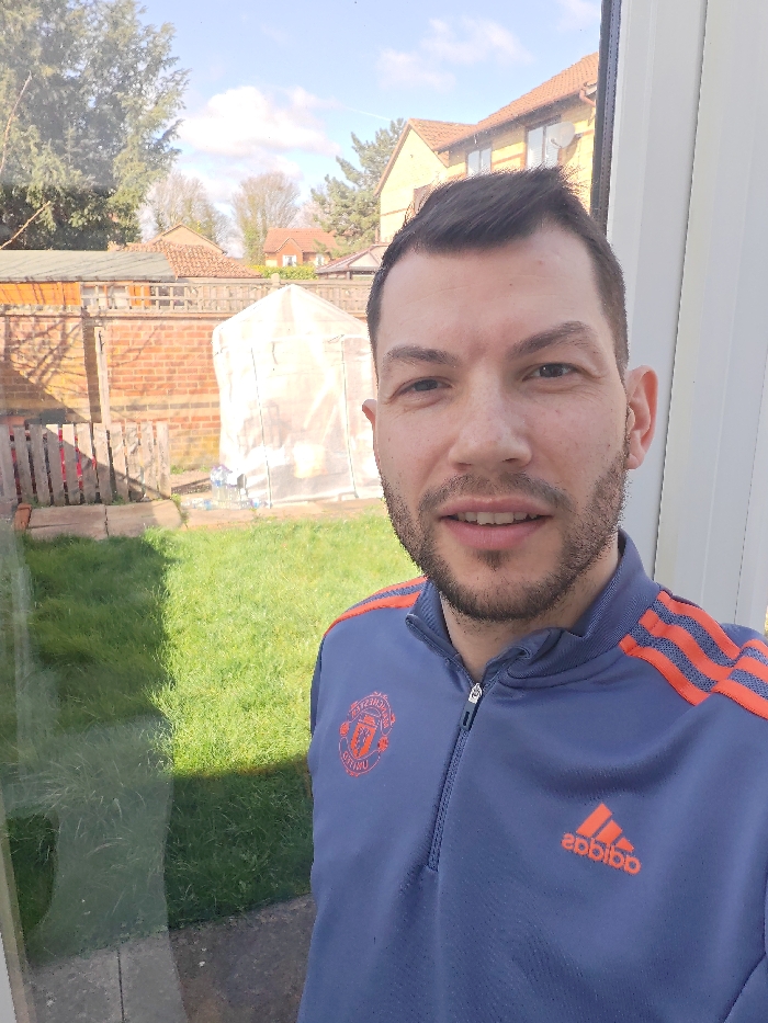 An adult male with light skin, short dark hair, and dark stubble is depicted in a medium shot, looking directly at the camera from inside a structure, observing a residential backyard in the Cherwell District, United Kingdom. He is wearing a blue-grey quarter-zip top with orange three-stripe detailing on the shoulders and sleeves. The left chest displays an orange Manchester United crest, while the right chest features an orange Adidas logo. A slight smile is present. The left side of the image shows a reflection of the outdoor scene on a glass surface, likely a window or door. The background features a green grass lawn, a paved area, and is enclosed by a brick wall and a wooden fence. A white, translucent pop-up greenhouse structure is visible towards the rear of the yard. Beyond the property lines, several residential houses with light-colored facades and reddish-brown tiled roofs are visible under a clear blue sky with scattered white clouds, alongside various trees, some with bare branches.