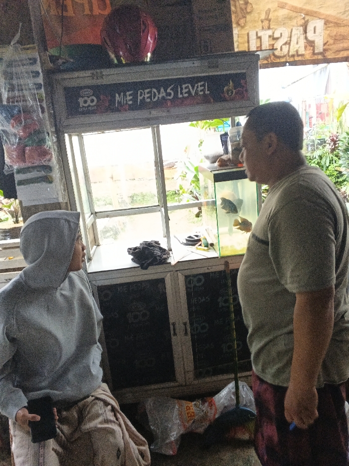 The scene depicts a small, open-fronted commercial establishment. Textual evidence on signage, including "MIE PEDAS LEVEL" and "100 EXTRA PEDAS," is in Indonesian, indicating the location is likely in Indonesia, not Uruguay. Two individuals are present. On the left, a person, likely a young adult female, is seated, wearing a light grey hooded sweatshirt with the hood up and a light-colored patterned sarong. She holds a dark smartphone in her left hand and directs her gaze towards the right. On the right, an adult male stands, facing left towards the counter and the seated individual. He wears a short-sleeved, light olive-green t-shirt and dark patterned shorts or a sarong, holding a small blue object in his right hand. The central feature is a white-framed display counter with a prominent glass serving window. Above this, a sign reads "MIE PEDAS LEVEL" with "100 EXTRA PEDAS" branding. A glossy red full-face motorcycle helmet rests on a shelf above this sign. To the right of the window, on the counter, a small glass aquarium contains two Cichlid-type fish. Below the main window, dark panels, possibly cabinet doors, feature additional "MIE PEDAS 100" branding. To the far left, a clear plastic bag containing colorful packaged items hangs. On the floor, a plastic bag with orange text and a broom with a dark handle are visible. Through the central window and to the right, bright natural light illuminates lush green foliage, indicating an outdoor area beyond the structure. Overhead, a wooden-textured sign with mirrored text, possibly "PASTI," is partially visible.