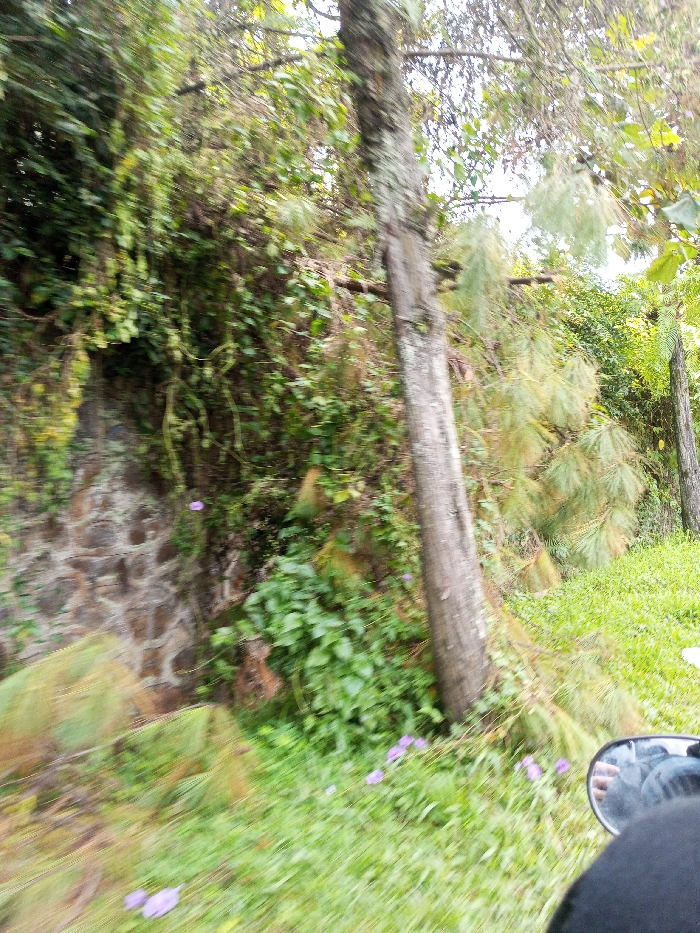 This image depicts a natural, overgrown roadside or path environment in Sukanagalih, Indonesia, captured from a moving vehicle. On the left, a stone retaining wall is heavily covered with dense green vegetation and various vines. Several small purple flowers are visible near the base of this wall. A prominent tree trunk with textured bark stands vertically in the midground, with branches bearing pine-like needles extending to its right. The ground in the foreground and to the right of the tree is covered in green grass, interspersed with additional scattered purple flowers. In the lower right corner, a portion of a vehicle's side mirror reflects a bare human foot and lower leg, positioned above a dark, indeterminate surface. The entire scene exhibits horizontal motion blur, indicating movement at the time of capture.