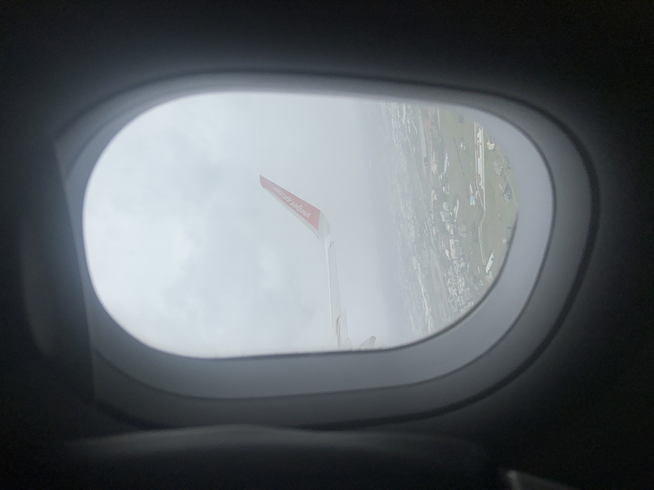 An aerial view from an aircraft window captures a suburban landscape in Taoyuan City, Taiwan, under an overcast sky