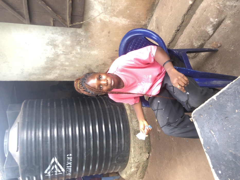 A young woman sits on a blue plastic chair beside a large black water tank marked with a white "STRONG" logo