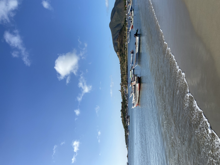 A vibrant blue sky dotted with fluffy white clouds stretches above a coastal scene. Tranquil turquoise water gently laps against a sandy beach. A series of colorful boats are docked parallel to the shore, near a verdant mountain range. A solitary figure stands beside one of the boats. The bright daylight creates a crisp and clear image.