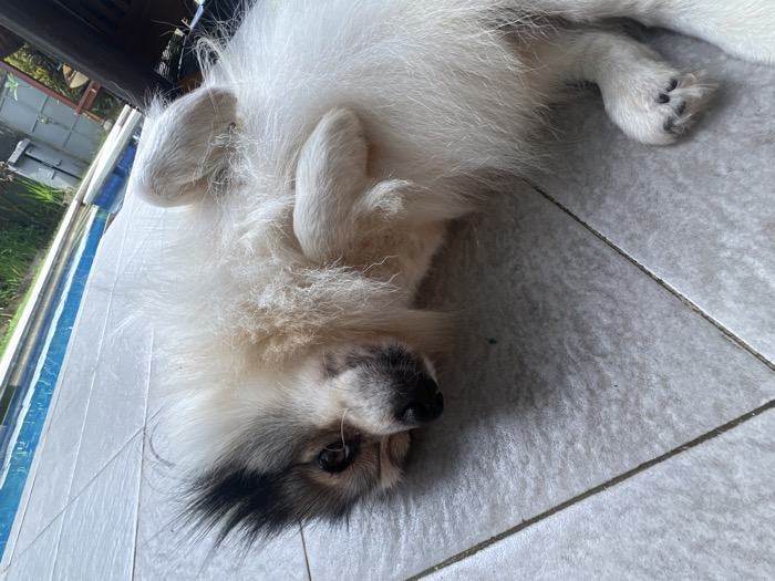 - "The image displays a white, long-haired dog lying on its back on a tiled floor in Pecatu, Indonesia" by FM-ge8sE3, licensed under CC BY 4.0