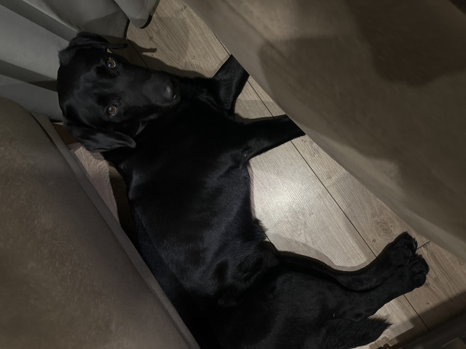 - "A black-coated dog, consistent with a Labrador Retriever, is depicted lying on its left side on a light-colored wooden floor in an indoor setting within Sofia, Bulgaria" by FM-HTYjc2, licensed under CC BY 4.0