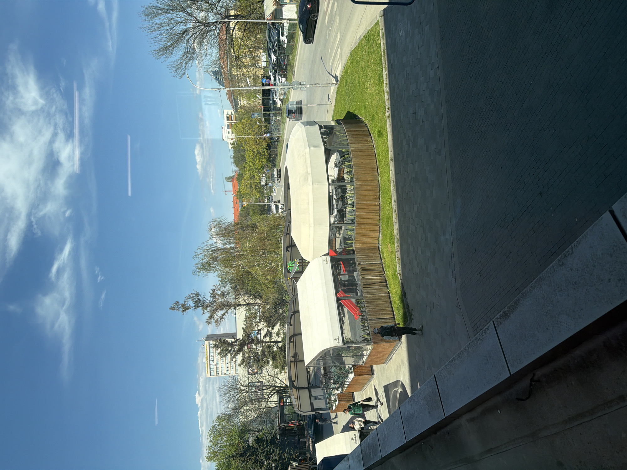 view overlooking a street scene in Sofia, Bulgaria, from a raised vantage point, likely a building window. The sky is blue with scattered clouds. The street has vehicular traffic, including cars. There are pedestrian walkways alongside the road with some people walking. One notable feature is a semi-circular building structure with an off-white roof and wooden sides, possibly a cafe or restaurant with outdoor seating. Vegetation, including trees and grassy areas, lines the street. The reflection of the sky and some objects can be seen in the window from where the image was taken.