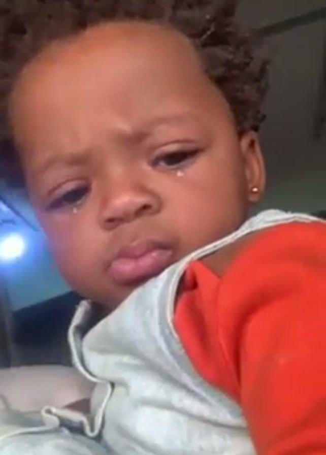 A young child with curly hair, wearing a light blue and white overall dress over a long-sleeved red shirt, is shedding tears and looking forlorn