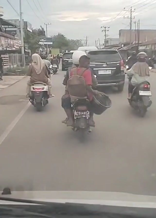 view from inside a car driving on a street with moderate traffic. In front, several motorcyclists are also driving. One motorcycle carries two passengers: the driver wearing a white helmet and a passenger with a backpack, holding a large black tub. The motorcycle's license plate, BE 5148 CU, is partially visible. The other motorcyclists are wearing headscarves. A black SUV is driving close behind the motorcycle. Buildings and utility poles line the sides of the road, and the sky is overcast.