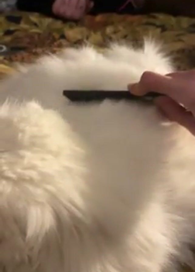 A person is brushing the fur of a large, white, long-haired animal with a black comb. The animal is lying on a patterned surface. Another person is visible in the background, sitting on the surface, but their actions are unclear. The primary focus is on the grooming of the animal.