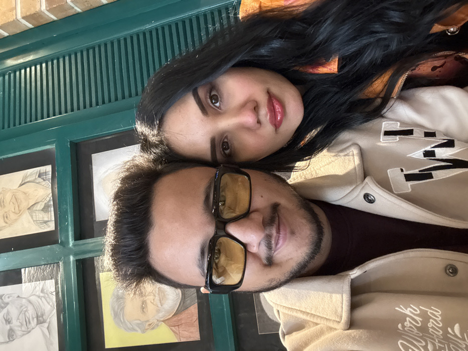 The image depicts two individuals, one male and one female, captured in a close-up indoor setting. The specific location within Mussoorie, India, is not identifiable from the visual evidence, but the environment suggests a commercial establishment such as a cafe or restaurant. The male, positioned on the left, has dark hair, a mustache, and stubble. He wears black, rectangular glasses with yellow-tinted lenses. His attire includes a maroon crew-neck shirt under a light beige collared jacket, which features 'Work Hard' embroidery on the left chest area and large black-and-white 'W' lettering on the right chest. The female, on the right, has long, dark hair, some strands exhibiting a blue or teal tint. She wears makeup, including lip gloss. Her visible clothing consists of an orange garment with a dark pattern. Both subjects face the camera directly. The background features a wall decorated with multiple framed pencil sketches of older men, one of which resembles the actor Rajinikanth. This wall incorporates dark green wooden paneling, possibly louvers or decorative shutters. A segment of light brown brickwork is visible on the far right.