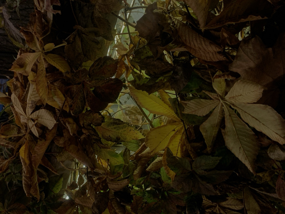 The scene, located in Odesa, Ukraine, presents a dense, close-up view of numerous dried and decaying leaves, predominantly from a deciduous tree, consistent with the palmate structure of a horse chestnut. The foliage occupies the entire frame, displaying a spectrum of autumn colors including various shades of brown, yellow, and muted green. Many leaves are curled, wrinkled, and show signs of senescence. Light filters through and behind the dense leaf arrangement, creating brighter areas, particularly in the mid-ground, against a darker, obscured background. No people, animals, or specific man-made objects are distinctly visible within the immediate foliage; only natural elements and diffuse background light are present. No actions or interactions are depicted. The overall environment suggests a natural setting, possibly a tree canopy or dense shrubbery, under dim, ambient lighting conditions.