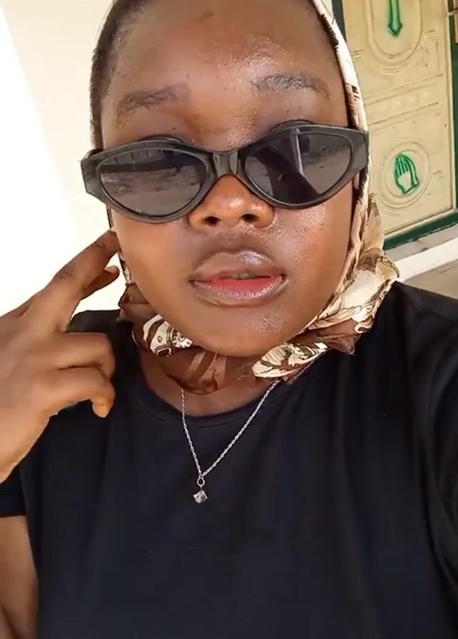 A woman is recording a selfie video in front of a light yellow building. She is wearing a black t-shirt, a silver necklace, a patterned scarf on her head, and black sunglasses. She has dark skin and her lips appear to have gloss on them. She touches her face a few times in the video.