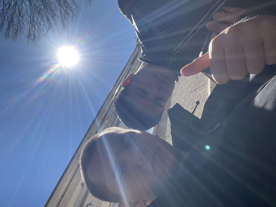 The scene takes place outdoors in the city of Pravets, Bulgaria, under a clear blue sky with direct sunlight. The sun is prominently visible in the upper right, generating strong lens flare and a multi-colored light refraction effect across the frame. A bare tree branch is visible in the upper right, and a light-colored building structure, appearing to be a wall or roofline, forms the background. Two males are present in the foreground. The male on the left is partially obscured, showing the top of his head and forehead, wearing a dark top. His face is largely in shadow. The male on the right is positioned below and to the right of the first, with his head tilted. He has short, dark hair and appears to have his eyes closed or squinted due to the bright light. He wears a dark jacket, which has lighter-colored detailing visible on the right shoulder area. His right hand is raised, performing a thumbs-up gesture.