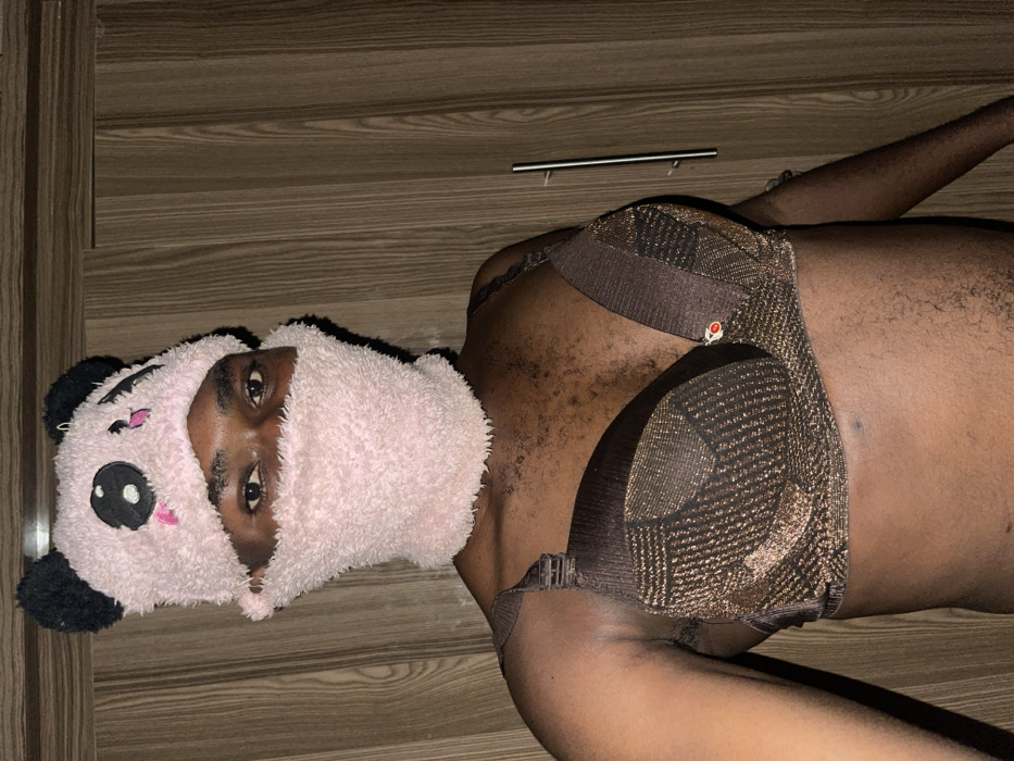 A person with brown skin wears a brown bra and a pink panda hat. They lie on a wood-paneled surface, which appears to be a floor or wall. The image is sideways, with the person's head on the left and their body extending to the right. The bra has a textured pattern. The panda hat is pink with black ears and a white face.