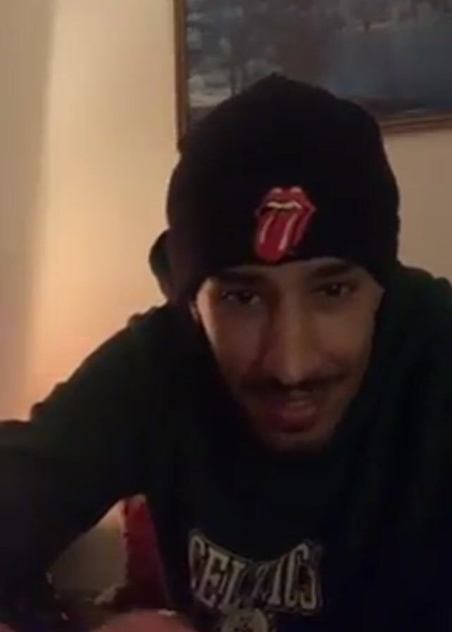 A man with a mustache and dark complexion wearing a black beanie with a Rolling Stones logo and a dark green Celtics hoodie is looking down and then runs his hand over the top of his head. He is sitting indoors in front of a beige wall with a framed picture on it. There is a red table surface visible at the bottom of the frame. There is background chatter audible.