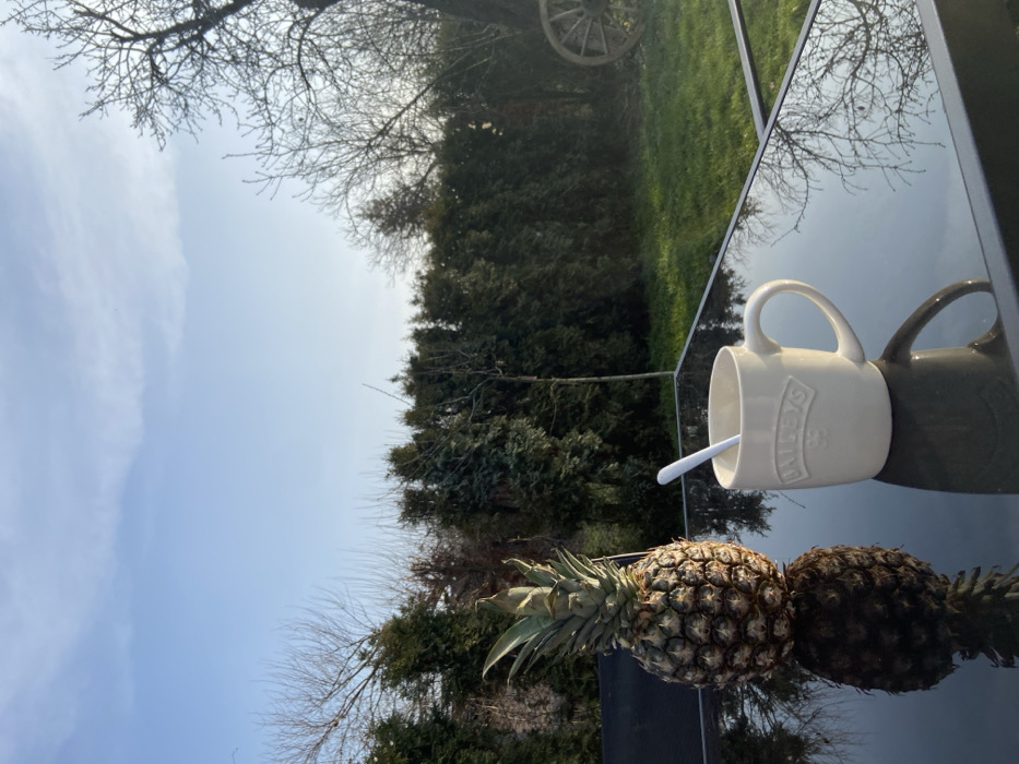 This image captures an outdoor scene in the city of Mindia, Bulgaria. In the foreground, a whole pineapple stands upright on the left side of a dark, reflective rectangular table. To its right, a cream-colored mug, embossed with "BAILEYS" and a shamrock logo, rests on the same table, containing a silver spoon. Both the pineapple and the mug cast clear reflections on the table's surface. The background features a long, dense hedge composed of tall, dark green coniferous trees. Beyond this hedge, a grassy lawn extends, and several deciduous trees with bare branches are visible. In the far right background, a weathered wooden wagon wheel leans upright. The sky is clear blue with minimal wispy clouds, indicating a bright, sunny day with sunlight reflecting on the table and illuminating the scene. No individuals or specific actions are depicted.