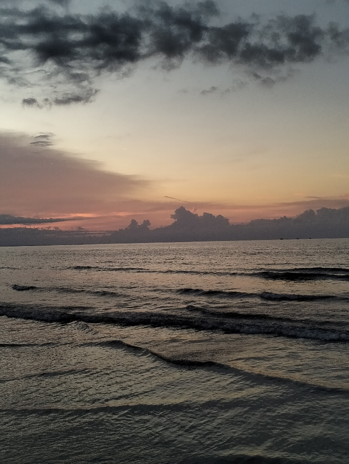 The image displays a coastal landscape during apparent twilight conditions, characterized by gradient lighting and wave action, identified as being in the city of Curehtunong, Indonesia. The upper half of the frame is dominated by the sky, exhibiting stratified cloud cover and a distinct color transition. The uppermost section features dense, dark grey, fragmented cloud formations. Below this, the sky transitions from a light grey-blue to a pale cream or muted yellow, then to a horizontal band of soft pink and orange hues immediately above the horizon line. Irregular, darker cumulus cloud formations are present along the distant horizon. The lower half of the frame depicts a body of water, likely an ocean or large sea, with a dark, reflective surface. Multiple parallel wave crests are visible, exhibiting dark troughs and lighter, slightly foamy peaks, indicative of water movement towards the viewer. The water itself appears dark grey-brown, reflecting the muted sky. On the far water horizon, several minute, dark, and indistinct shapes are faintly visible, potentially distant vessels or structures. No human figures or discernible actions are present in the scene. The horizon line is clear and relatively flat, separating the sky and water at approximately the mid-frame point.
