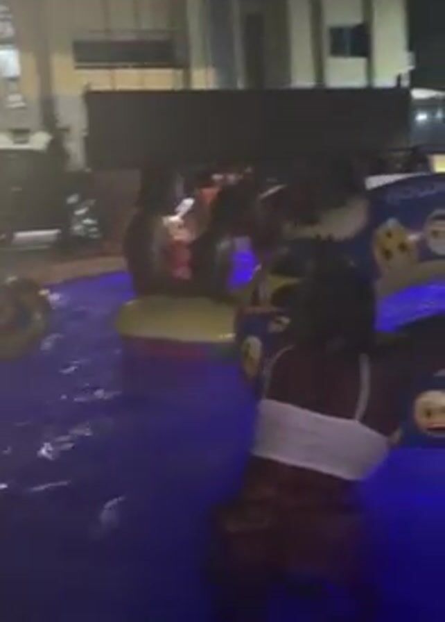 nighttime gathering with people in an inflatable pool, some wearing swimsuits. There are inflatable rings and a large inflatable with emoji designs. A building is visible in the background, along with parked cars. Some people are standing or walking by the pool, and there are red plastic cups nearby. The pool is lit with blue lighting.