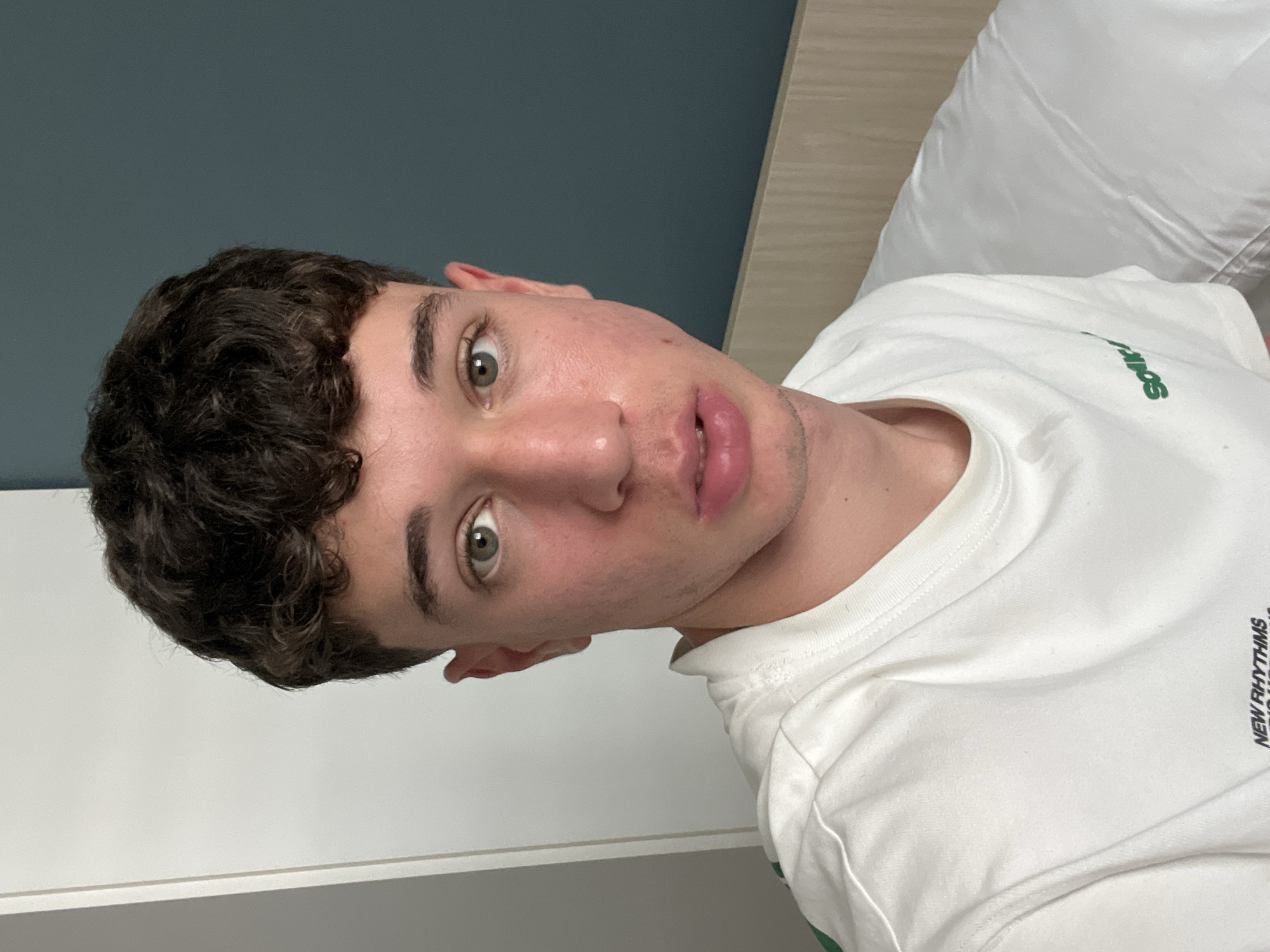 The image displays a close-up, eye-level portrait of a young adult male. He has short, dark brown, curly hair, light green eyes, and a fair complexion with minor skin redness. His mouth is slightly open, and his gaze is directed forward. He wears a white short-sleeved t-shirt featuring black text "NEW RHYTHMS" and partially visible additional text below on the lower left side, and a green logo with the word "SOKK" partially visible on the right chest area. The subject is situated indoors, within a modern room in Turin, Italy. The background includes a vertical white panel or door frame on the left, a solid teal-blue wall section on the upper right, and a light wood-paneled surface stretching horizontally across the lower right, with a white pillow or bedding visible.