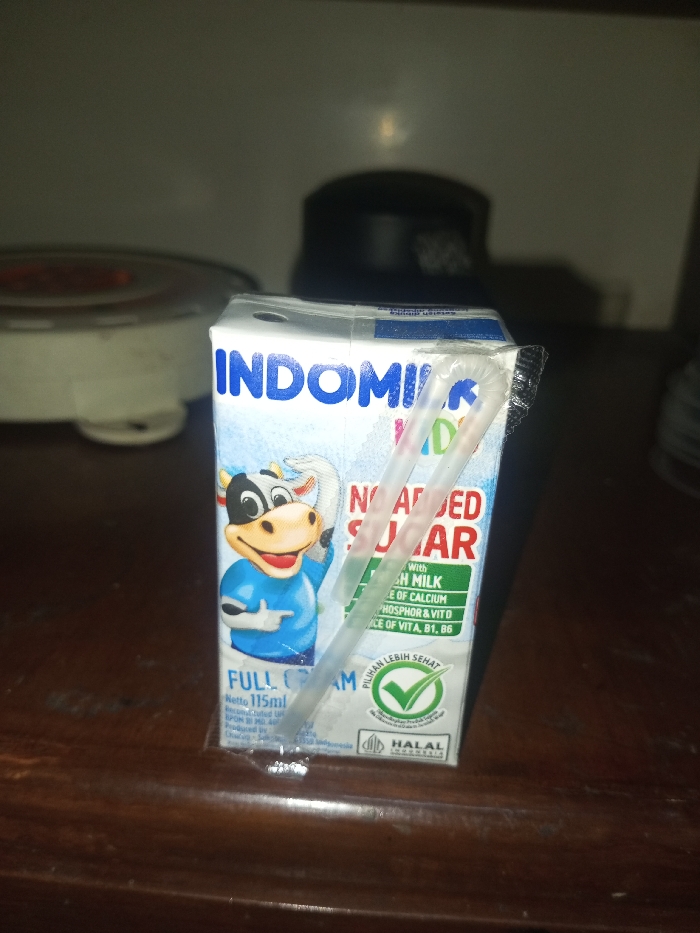 - "The image displays a single, upright Indomilk Kids full cream milk carton, 115ml, positioned on a dark brown, wood-grained surface in Karwan, India" by FM-Rb2su2, licensed under CC BY 4.0