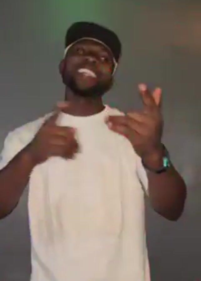 A DJ is performing in a dimly lit club or event space. The DJ, a Black man with a beard, wears a white T-shirt and a black and white baseball cap. He is standing behind a professional DJ mixing console. The lighting is variable, shifting between red, purple, and white. The DJ is gesturing with his hands, dancing, and looking at the camera as he interacts with the music. The background is a plain gray wall.