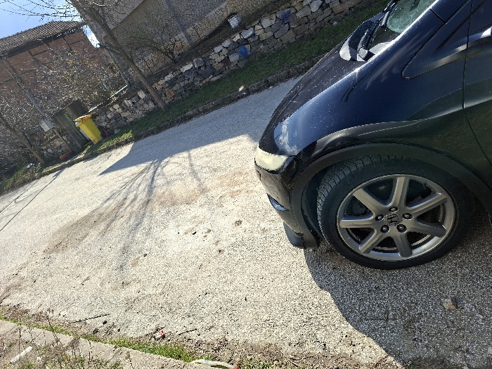 The image depicts an outdoor scene on a clear, sunny day in Rakitovo, Bulgaria, likely a residential street. The primary subject is the front right quarter of a black vehicle, specifically a Honda Civic, visible from the headlight and front fender to the wheel and tire, occupying the right side of the frame. The vehicle features multi-spoke grey alloy wheels with a visible Honda logo on the hubcap. The paintwork appears clean but shows some minor dust or reflections. The vehicle is parked or positioned on a light-colored, granular paved surface, likely concrete or asphalt, which covers the majority of the ground plane. This surface exhibits some dirt, scuff marks, and scattered debris. Strong, elongated shadows from unseen objects or bare trees are cast across the pavement, extending from the upper right towards the lower left. In the mid-ground and background, the scene transitions to a residential setting. A concrete curb with sparse green and dry vegetation is visible along the lower left edge. Further back, a bright yellow refuse bin stands near a rough stone wall, which forms a boundary. Behind the wall, a house with a reddish-brown tiled roof and light-colored walls is partially visible, obscured by several bare deciduous trees. The sky is bright blue and cloudless. No individuals are present within the frame.