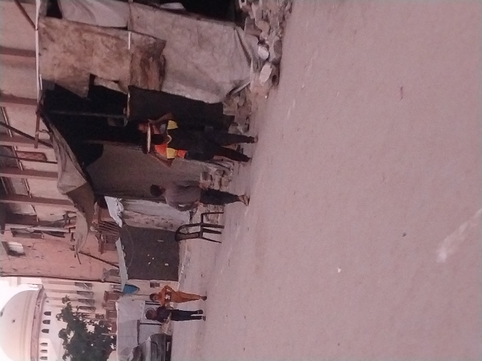 The image depicts a street scene in Khan Yunis, Palestinian Territory. In the background, a light-colored mosque featuring a large dome and arched windows is prominently visible on the left. Adjacent to the mosque, a silver vehicle is partially seen. The middle ground is dominated by a series of makeshift shelters, constructed from tarpaulins, fabric, and wooden frames, with visible rubble and debris accumulated at their bases. These shelters are situated in front of a multi-story building that appears to have exposed structural elements or damage. Several individuals are present on the street: 1. Two children are walking towards the left side of the frame. The lead child wears dark clothing, while the child following wears a light-colored, possibly tan or orange, full-body garment. 2. Closer to the makeshift shelters, a male individual wearing a light gray long-sleeved shirt and dark pants stands near a black plastic chair placed on the street. 3. To the right, another male individual, wearing a dark shirt with yellow accents on the shoulders, walks while balancing a light-colored, round, flat object (likely a tray or large dish) on his head. 4. A fifth individual's head is visible peering out from within one of the makeshift structures. The street itself appears unpaved or covered in dirt, with scattered small debris.